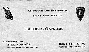 In the early '20s they build the garage annex in Upper Red Hook. William Franklin and Dorothy (Simmons) Triebel lived as newlyweds in a house near the Episcopal Church in Upper Red Hook. That house had no indoor plumbing or water. When Route 9 was paved the road no longer went through Upper Red Hook. Traffic was also down and the crash had occurred. The annex was closed and Franklin and Dorothy moved to Red Hook to live in an apartment over the garage in Red Hook."